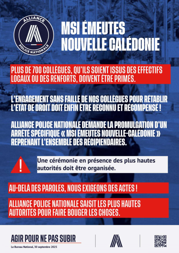 📜 Alliance Police Nationale demande la promulgation d’un arrêté spécifique « MSI Émeutes Nouvelle-Calédonie » reprenant l’ensemble des récipiendaires.